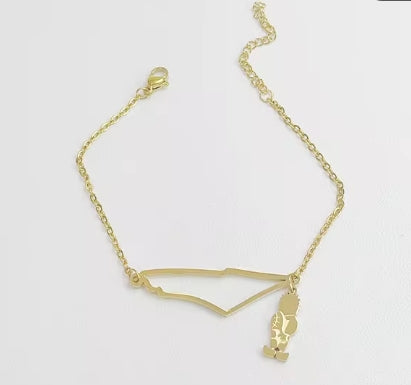 Le bracelet en acier inoxydable, finement détaillé représente les contours de la Palestine, avec un pendentif représentant Handala, également Handhala, Hanzala ou Hanthala, est une figure allégorique nationale de la Palestine, symbole de la résistance palestinienne.