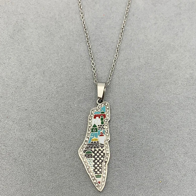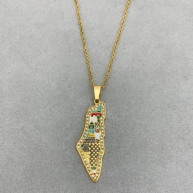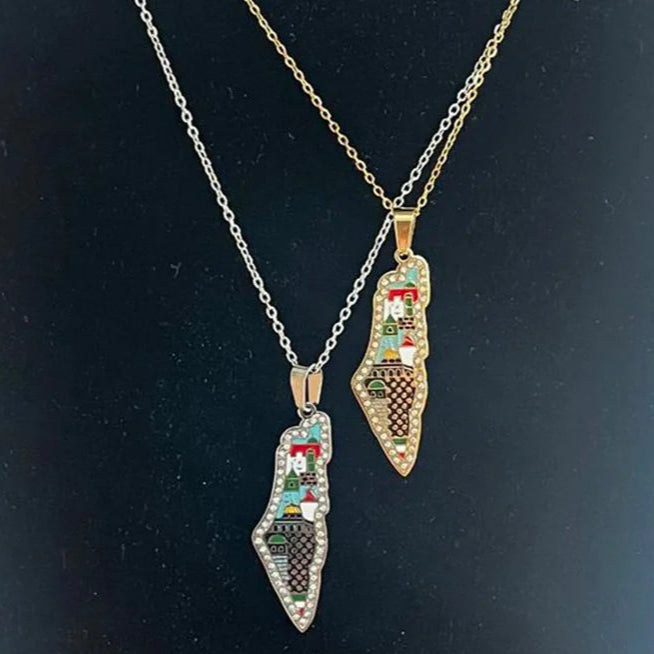 Un bijou porteur d’histoire, de culture et d’engagement Ce collier représente la carte de la Palestine avec une illustration artistique riche en détails : le Dôme du Rocher, des bâtisses traditionnelles aux toits colorés, des arbres stylisés, le tout entouré d’une fine bordure perlée. Ce bijou allie élégance et symbole fort, pour garder la mémoire de la Palestine tout contre soi.
